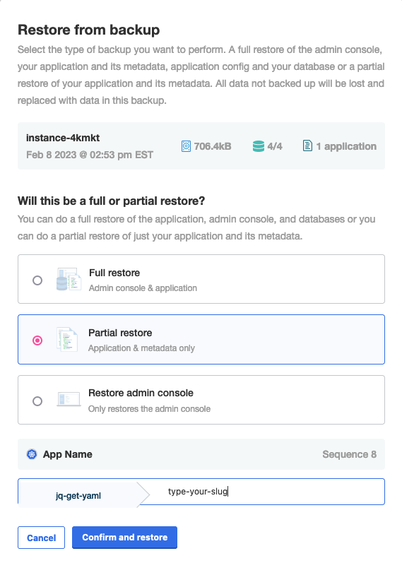 • Only full backups can be restored using the KOTS CLI. To restore an application from a partial backup, use the Admin Console. See Restore the Application Only Using the Admin Console.