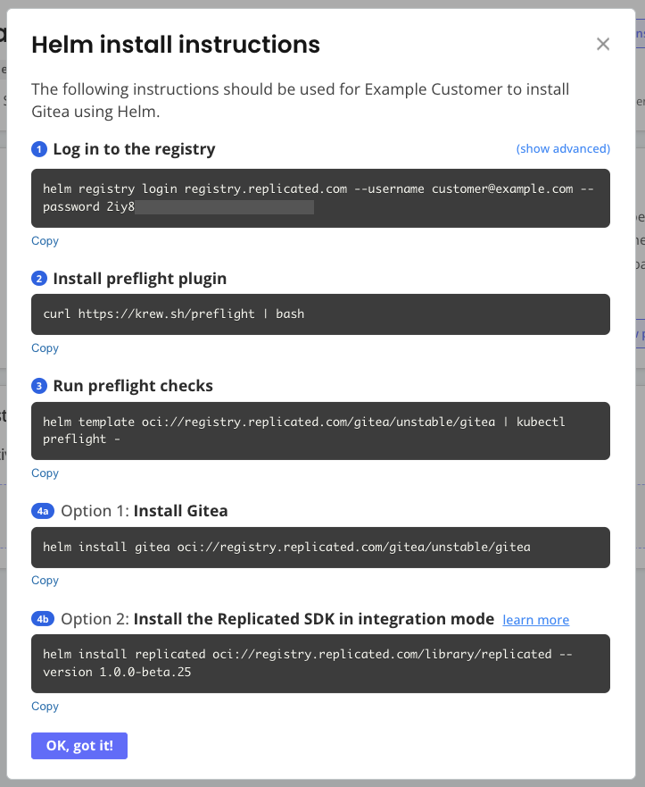 Installation instructions for the Helm CLI and Replicated Embedded Cluster are customer-specific. You can find installation instructions on the page for the target customer.